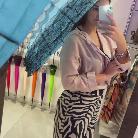 Ombrello colorato con ricami in pizzo per un tocco di stile ed eleganza anche sotto la pioggia.